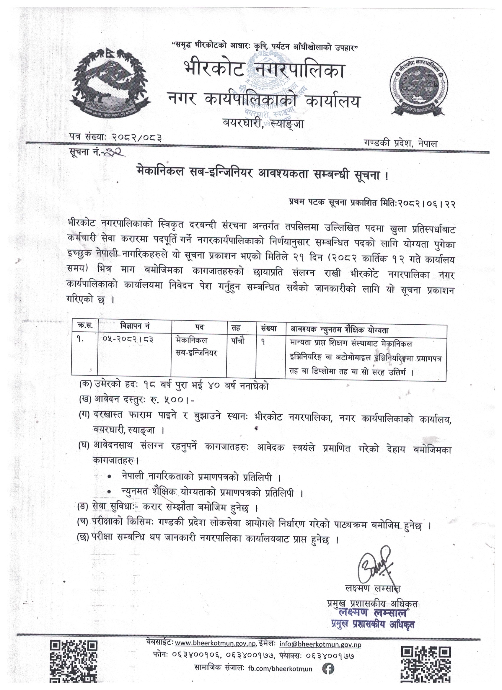 मेकानिकल सब-इन्जिनियर आवश्यकता सम्बन्धी सूचना !