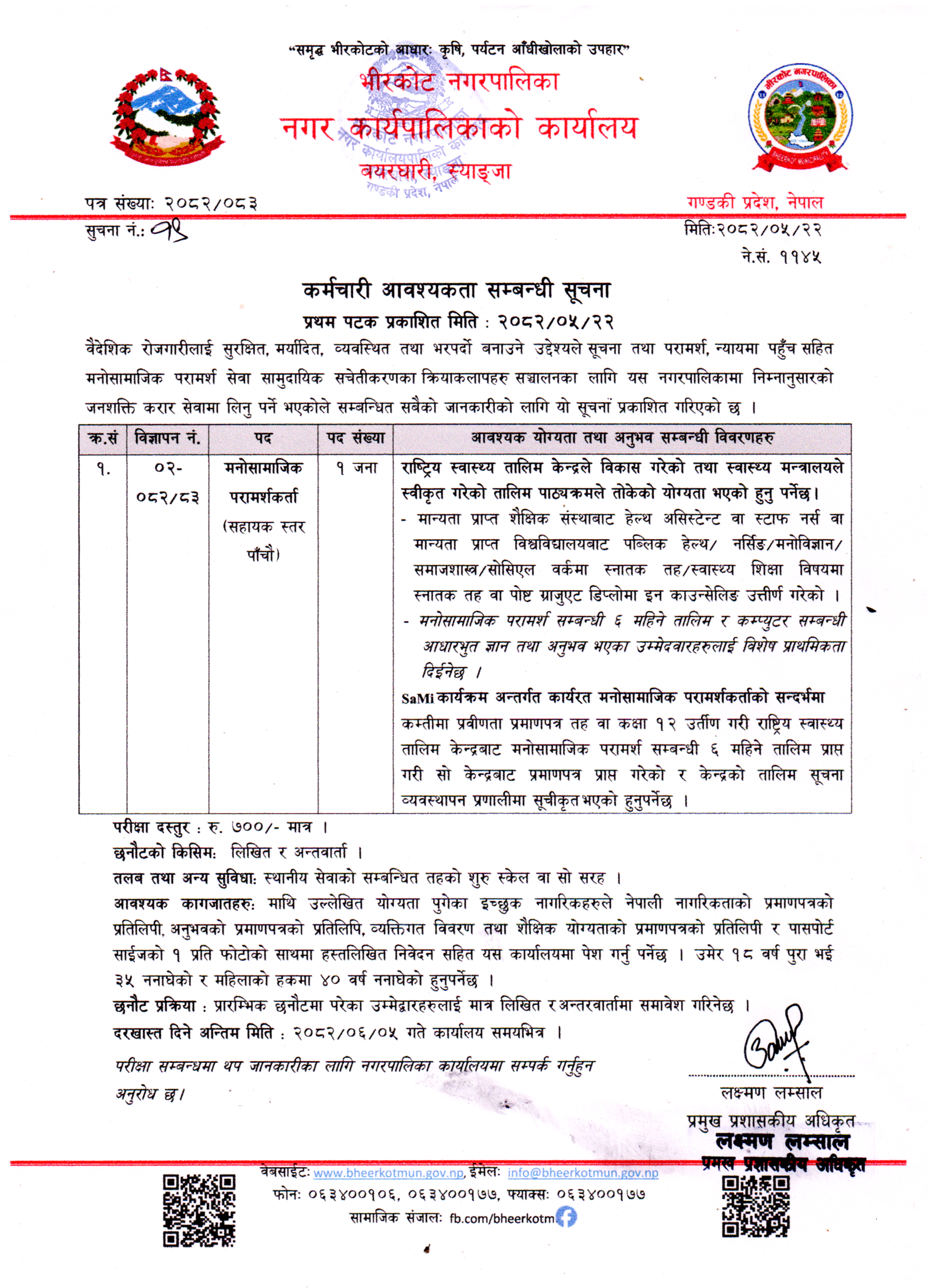 कर्मचारी आवश्यकता सम्बन्धी सूचना !