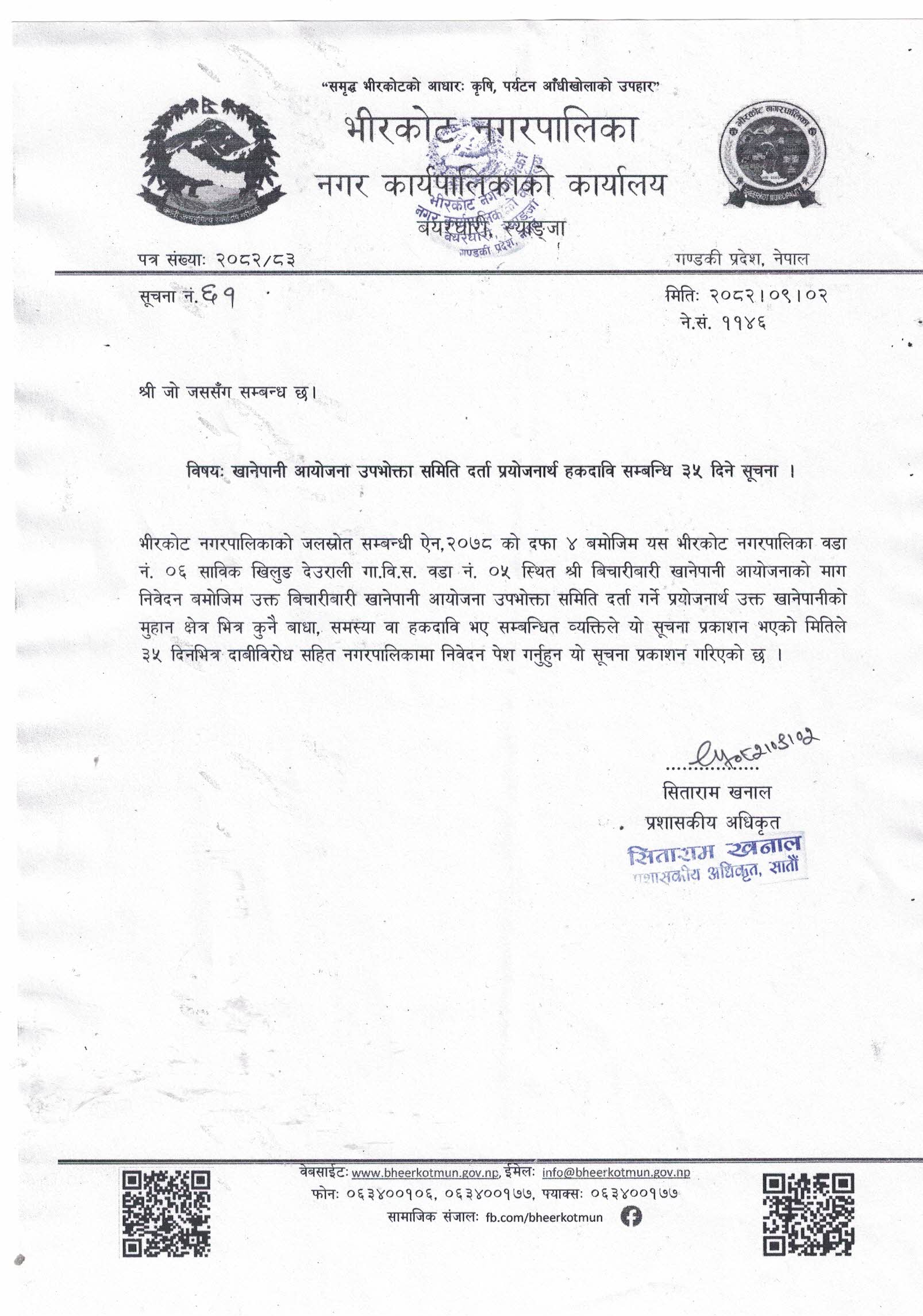 खानेपानी आयोजना उपभोक्ता समिति दर्ता प्रयोजनार्थ हकदावि सम्बन्धी ३५ दिने सूचना !